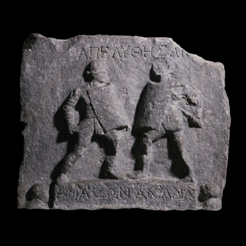 On olemassa myös muutamia tunnettuja ja aikanaan ihailtuja naisgladiaattoreita. Heistä kaksi on kuvattuna reliefiin, joka on löydetty Halikarnassoksesta ja on nykyisin nähtävillä British Museumissa (kuvassa). Reliefissä esiintyvät taistelijat ovat Amazon ja Akhillia. Nimi Amazon viittaa legendaarisiin, hevosilla taisteleviin naisiin, joita hallitsi kuningatar ja jotka eivät sietäneet miehiä ympärillään. Akhillia taas oli kuin naispuolinen Akhilleus, Troijan myyttinen sankari. Naiset on kuvattu samanlaisissa varusteissa kuin miehetkin. Kummallakin gladiaattorilla on kaareva kilpi (scutum) ja lyhyt pistomiekka. Käsivarsissa on suojukset (manicae) ja jaloissa säärisuojat. Vain kypärät puuttuvat. Varusteiden tarkoitus oli suojata taistelemista haittaavilta vammoilta, mutta samalla jättää kantaja alttiiksi tappaville iskuille. Reliefissä kuvan yläreunassa on teksti apelythïsan, joka on kreikkalainen vastine käsitteelle stantes missae, joka tarkoittaa, että naiset taistelivat urheasti ja pääsivät poistumaan arenalta kunniakkaasti ja elävinä. Tämä oli yleensä palkkio erityisen jännittävästä kamppailusta, jollaisesta nyt oli selvästikin kysymys, koska kansalaisten mielestä ottelua tulisi muistaa veistoksella.